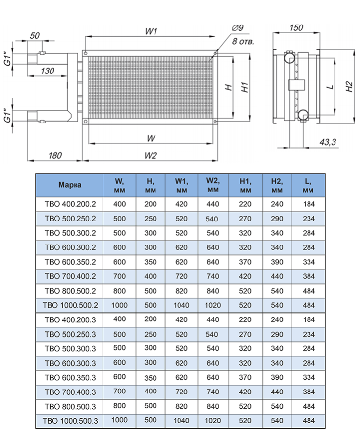 Корпус нагревателя выполнен из оцинкованной стали. Теплообменник состоит из медных труб с алюминиевыми ребрами (ламелями). Выпускается в 2-х и 3-х рядном исполнении. В качестве теплоносителя используется вода или незамерзающие смеси. Коллектор сварен из стальных труб, патрубки заканчиваются наружной трубной цилиндрической резьбой G1-B.