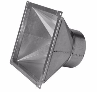 Прямоугольные переходы с прямоугольного сечения на круглое сечение позволяют соединить две магистрали воздухопровода с разными размерами и/или формами сечений. При заказе перехода необходимо указать способ соединения с магистралью воздуховода. По умолчанию прямоугольная сторона перехода снабжена шинорейкой 20, под заказ можно изготовить с шинорейкой 30 или сделать без шинорейки гладкий край. Сторона с круглым сечением по умолчанию имеет ниппельное соединение, под заказ можно изготовить с фланцевым соединением из уголка, с отбортовкой нужного размера.
